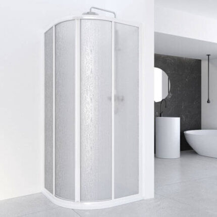 Mampara corredera curva para ducha. Vidrio de seguridad de 3 mm. Disponible en ACRÍLICO. Compensación de perfiles de 30 mm por cada lateral. Equipada con cierre magnético. Teknoclean incluido.