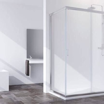 Mampara corredera para ducha. Vidrio de seguridad de 3 mm. Disponible en ACRÍLICO. Compensación de perfiles de 20 mm por cada lateral. Equipada con cierre magnético. Mampara reversible. 4 Rodamientos por hoja. Teknoclean incluido en vidrio.