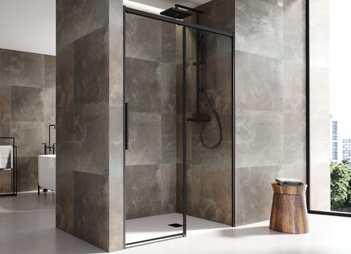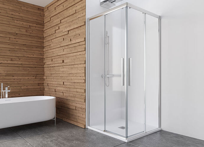 Shower screen with sliding doors with lower bearings. 8 mm tempered glass. Profile compensation of 10 mm. Anti-tipping system. Profile finishes in Matte White, High Gloss Silver, Chrome and Black. Roma handle as standard in finishes…
