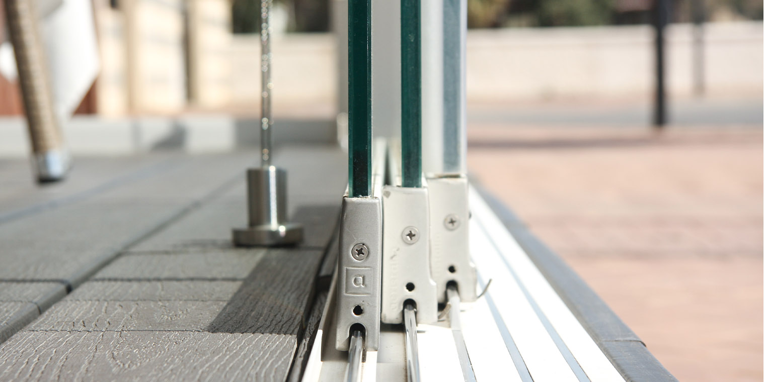 Corredera panorámica de cristal con paneles de hasta 3,5m de altura. Sin perfiles verticales. Carriles de acero inoxidable. Deslizamiento suave.
