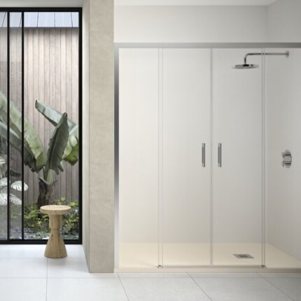 La mampara ZEN combina un panel fijo con una hoja abatible, creando un acceso cómodo con estética minimalista. La colección ZEN de Doccia se distingue por su acabado premium y sus líneas depuradas.