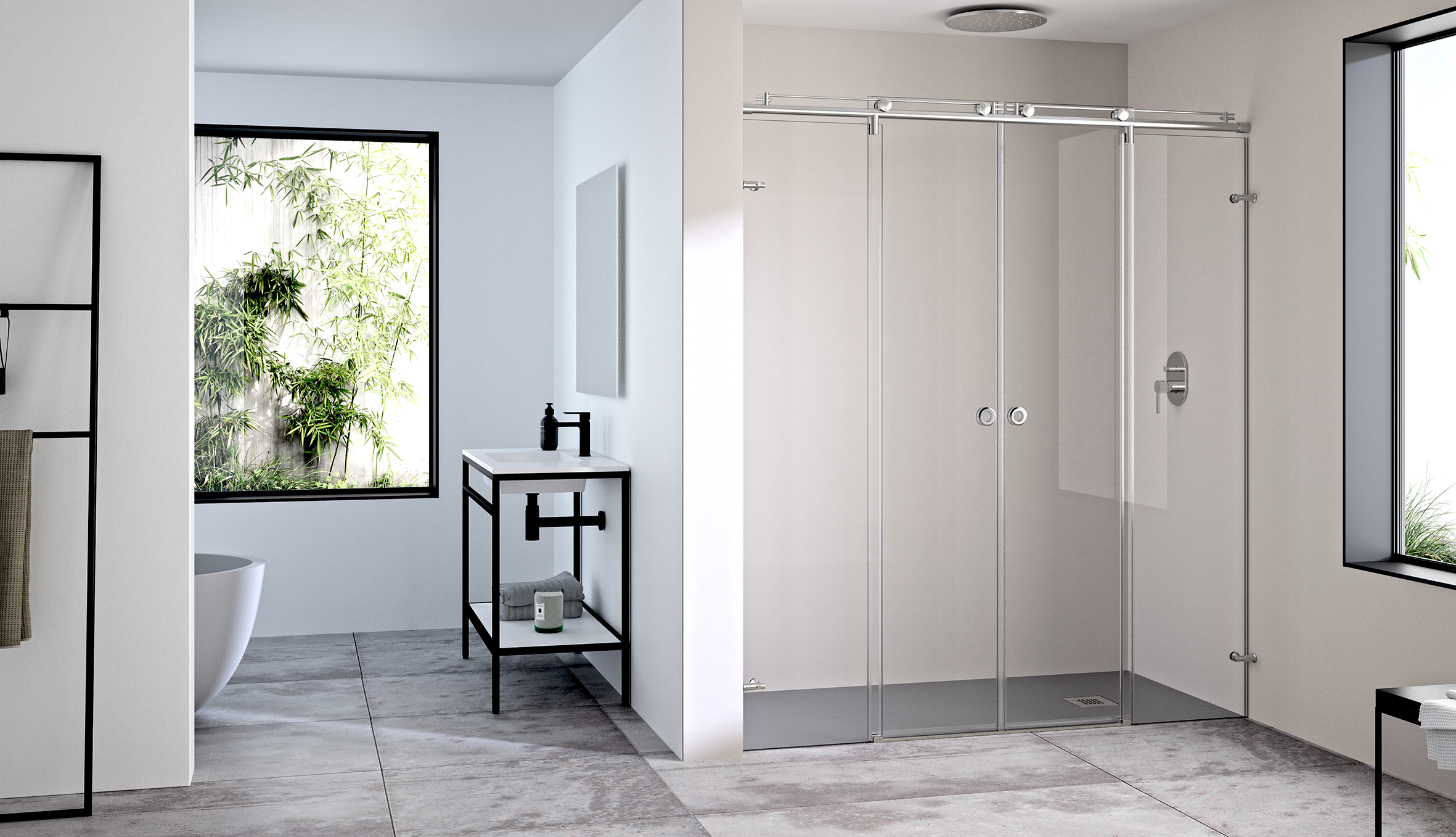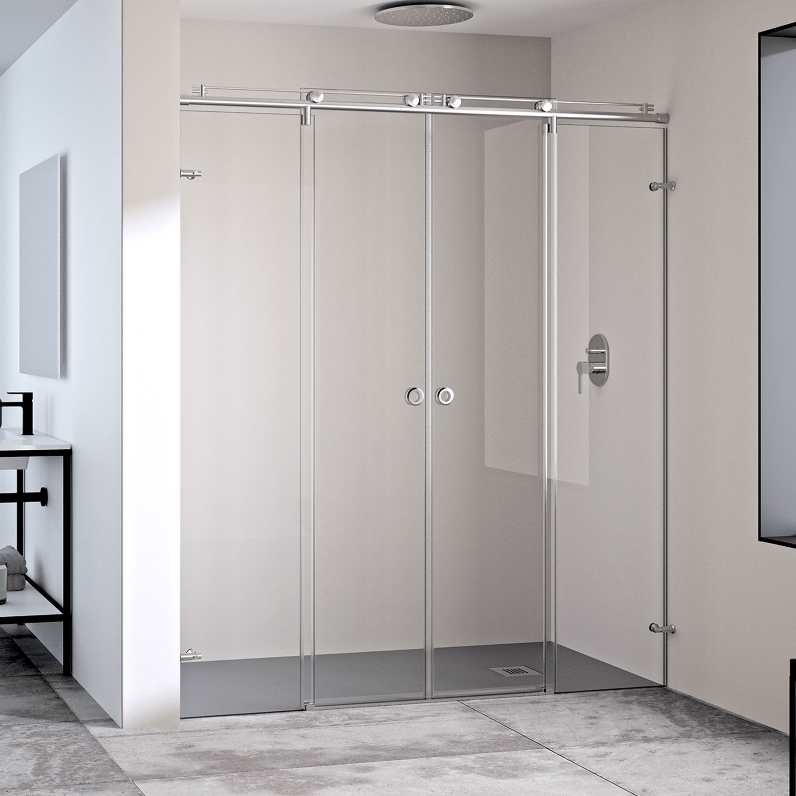 Mampara de ducha frontal de dos hojas correderas y dos fijas