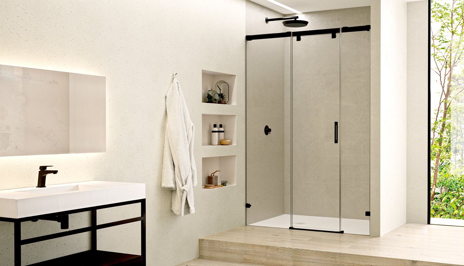 Mampara de ducha Doccia BOSTON. Colección ARIES. Mampara de ducha frontal de dos hojas correderas y dos hojas fijas Vidrio de 8mm. Altura: 1950mm. SC, Antical, Extraible.