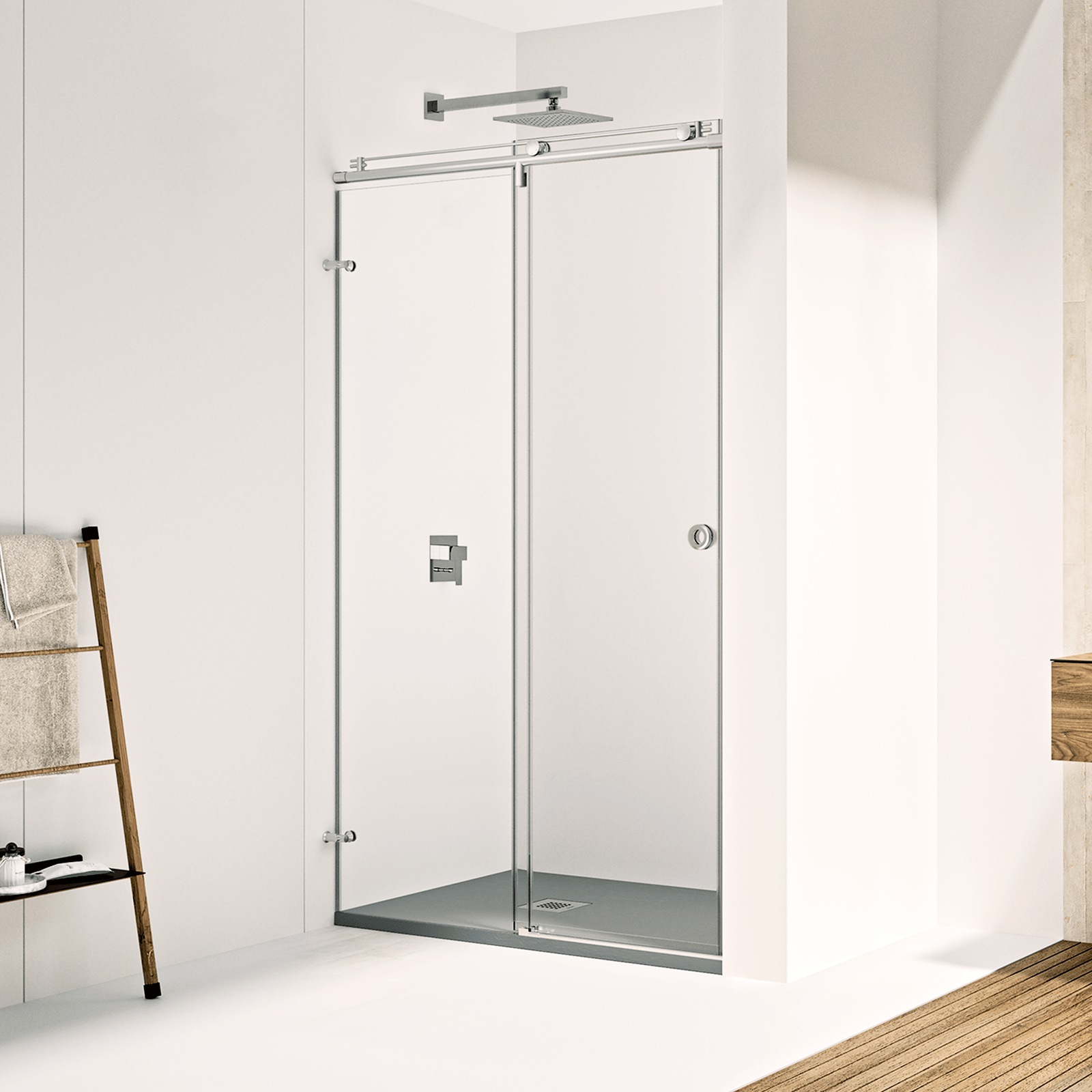 Mampara de ducha Doccia RODAS. Colección ESCORPIO. Mampara de ducha frontal de una hoja corredera y una hoja fija Vidrio de 4mm. Altura: 1870mm. Reversible.